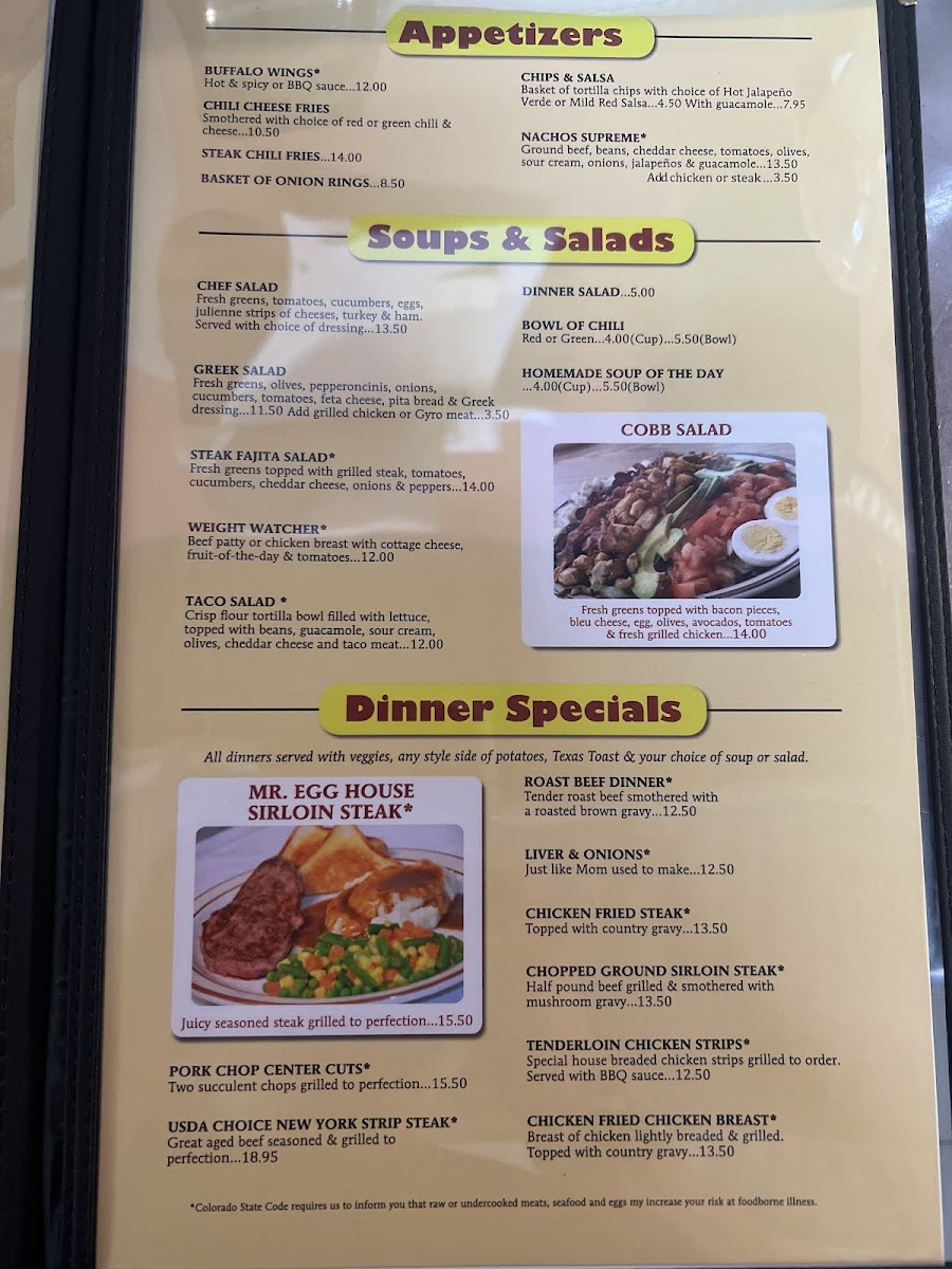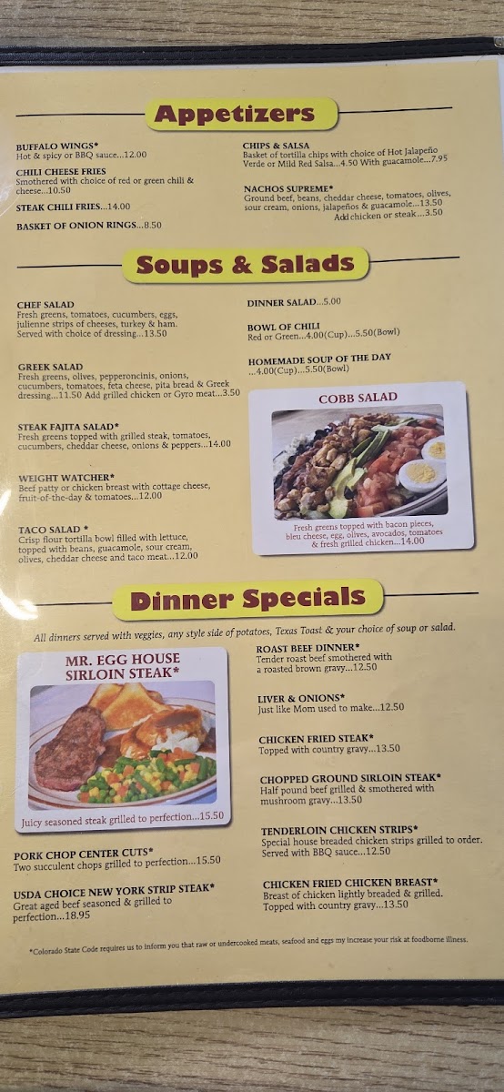 The menu at Mr. Egg celebrates classic American breakfast with a twist, putting a hearty spin on some beloved favorites. Start your culinary journey with Buffalo Wings tossed in either a hot and spicy or BBQ sauce for just $6.95, or indulge in the Chill Cheese Fries, smothered in your choice of red or green chili and topped with melted cheese for only $5.95. Each appetizer is a testament to the restaurant’s commitment to flavor and quality.