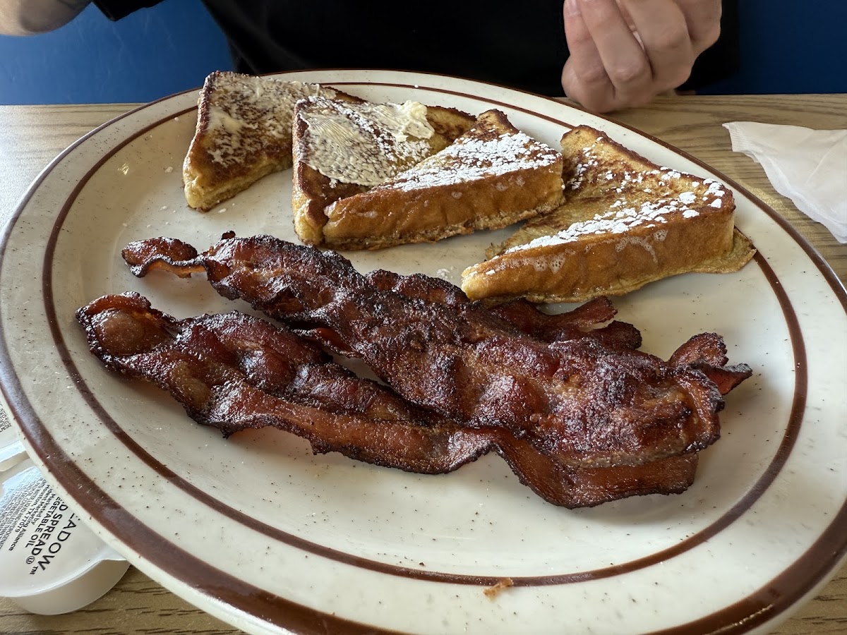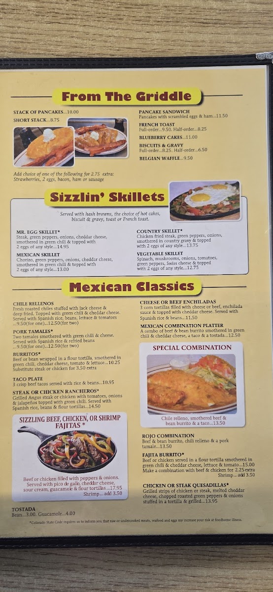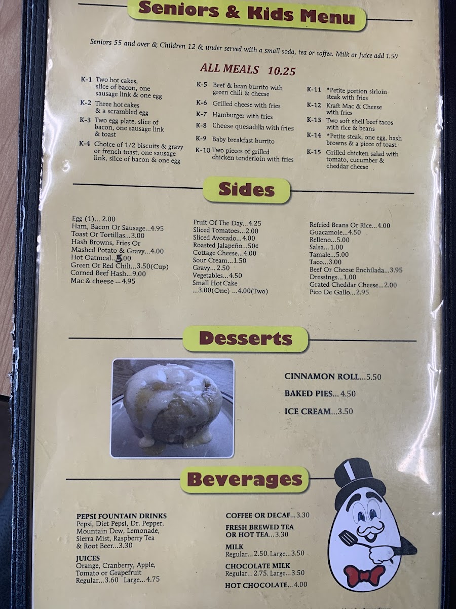 But the true stars of the menu are undoubtedly the omelets, especially the Mr. Egg Fresh Omelet, which boasts an impressive mix of bacon, ham, sausage, green peppers, onions, tomatoes, fresh mushrooms, cheddar cheese, and green chili for $8.95. Or consider the Meat Lovers Omelet, packed full of flavors that meat lovers will absolutely adore—all for just $7.95. You can complement your omelet with a side of hot cakes, biscuit and gravy, or any of their delightful sides.